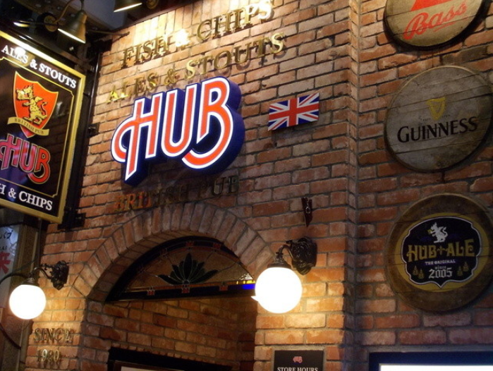 HUBはクラフトビールやフィッシュ&チップス、スポーツ観戦などが楽しめる英国風パブ。